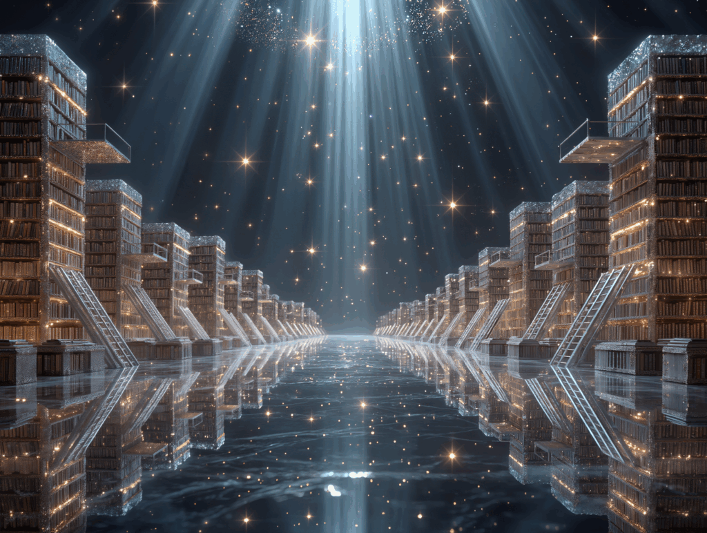眩しい光が一面に広がり、無数の本棚が現れました。
